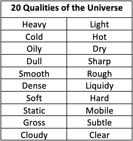Ayurveda can be understood through the lens of the 20 Tattvas, the 20 qualities that can be used to describe everything in the universe.